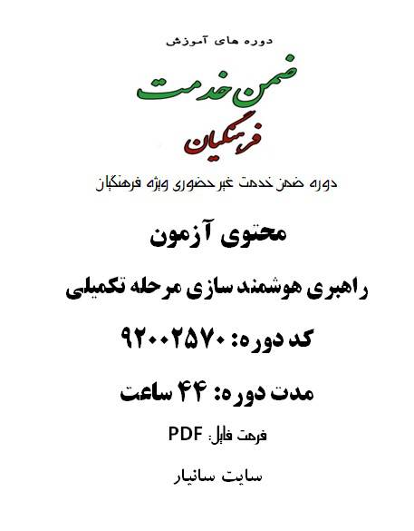 دوره ضمن خدمت غیر حضوری ویژه فرهنگیان محتوی آزمون راهبری هوشمند سازی مرحله تکمیلی کد دوره: 92002570 مدت دوره: 44 ساعت فرمت فایل: PDF سایت سانیار